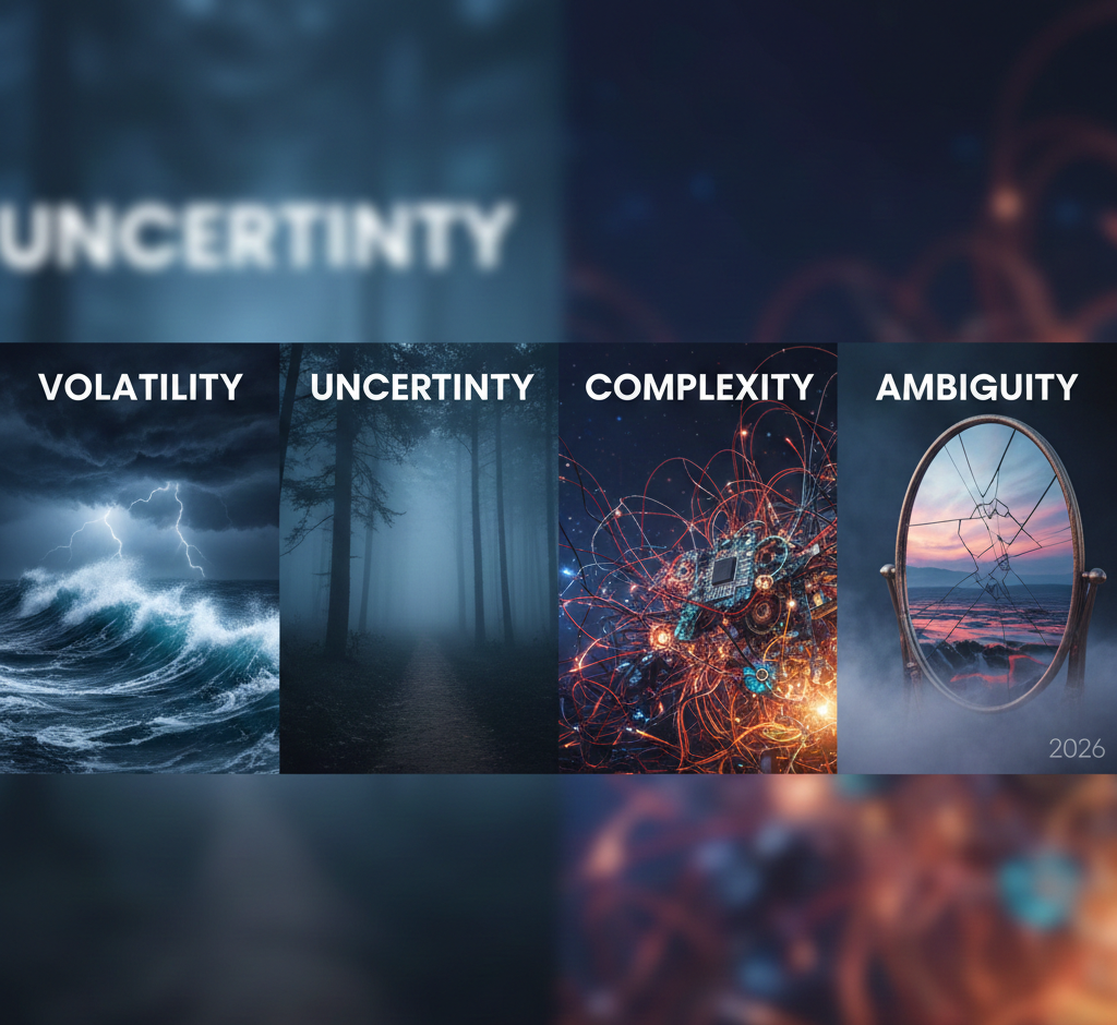 VUCAとは、変化が激しく、不確実で、複雑かつ曖昧な要素が重なり、将来予測が困難な時代を表す概念である。