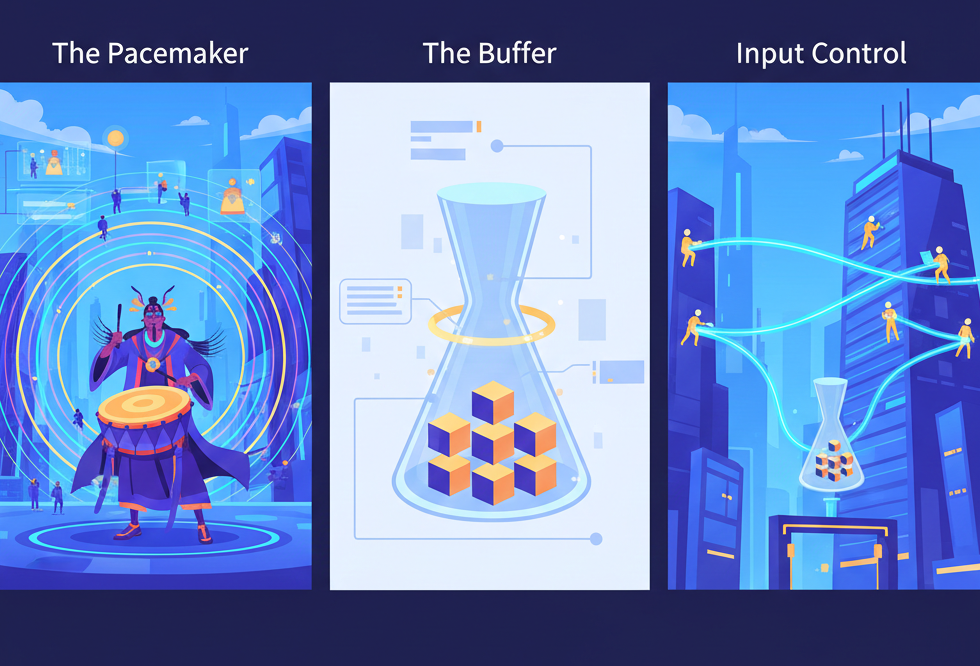 • 太鼓を叩いて行進の歩調を合わせるように、ボトルネックの処理スピード/タイミングを合わせてシステム全体の出力(スループット)を決定します。
