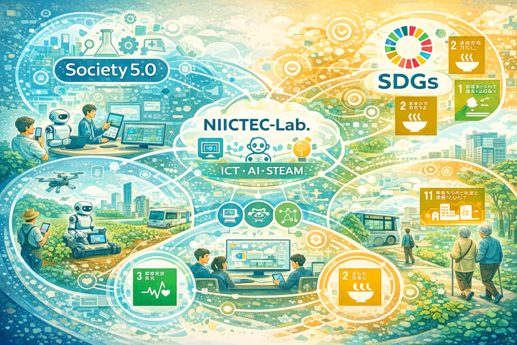NIICTEC-Lab.では、Society5.0の考え方を、日常生活や企業活動と結びつけてとらえ、SDGsの理念をICT・AI・STEAM教育と結びつけ、身近な課題を具体的な実践へとつなげることを意識しています。